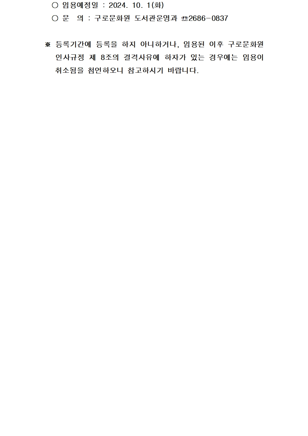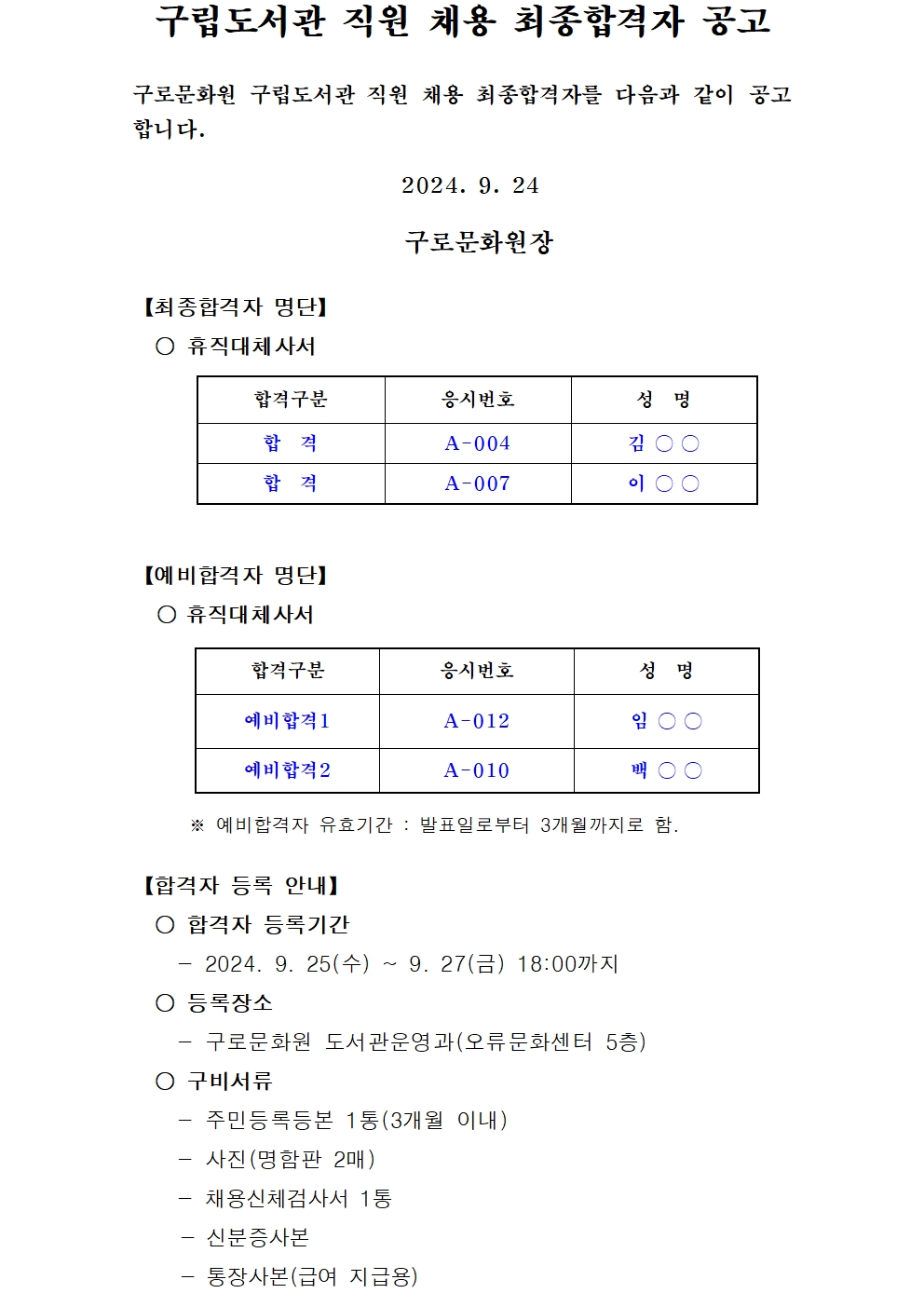 구로문화원 구립도서관 직원채용 최종합격자 공고
