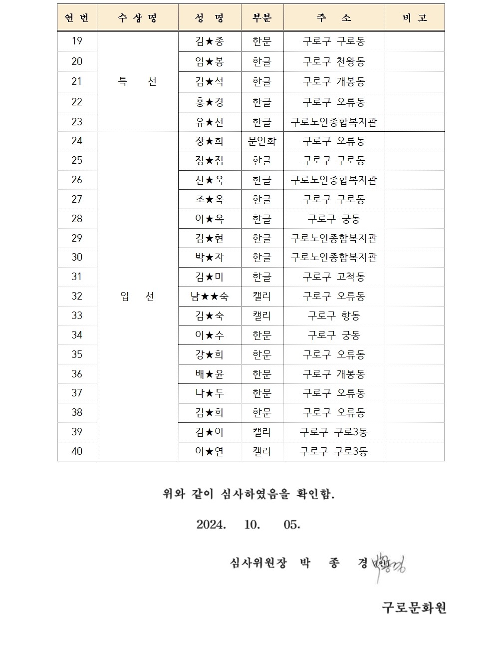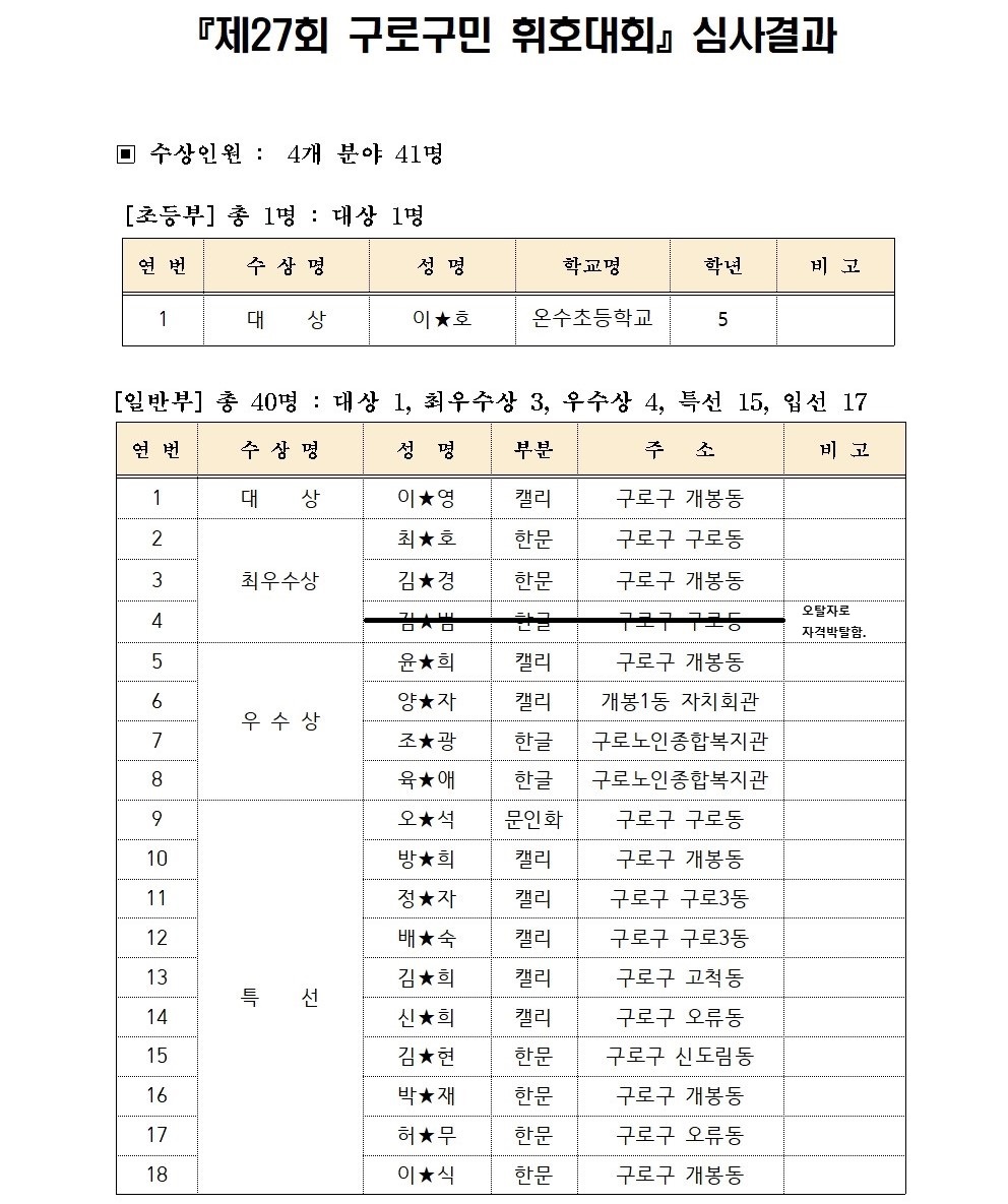 제27회 구로구민 휘호대회 참여 해 주신 모든 분들께 진심으로 감사드립니다.