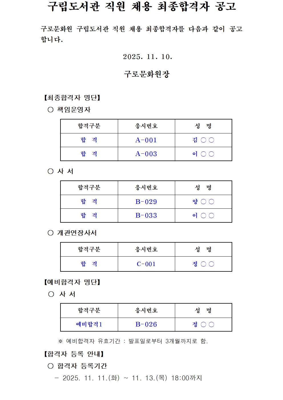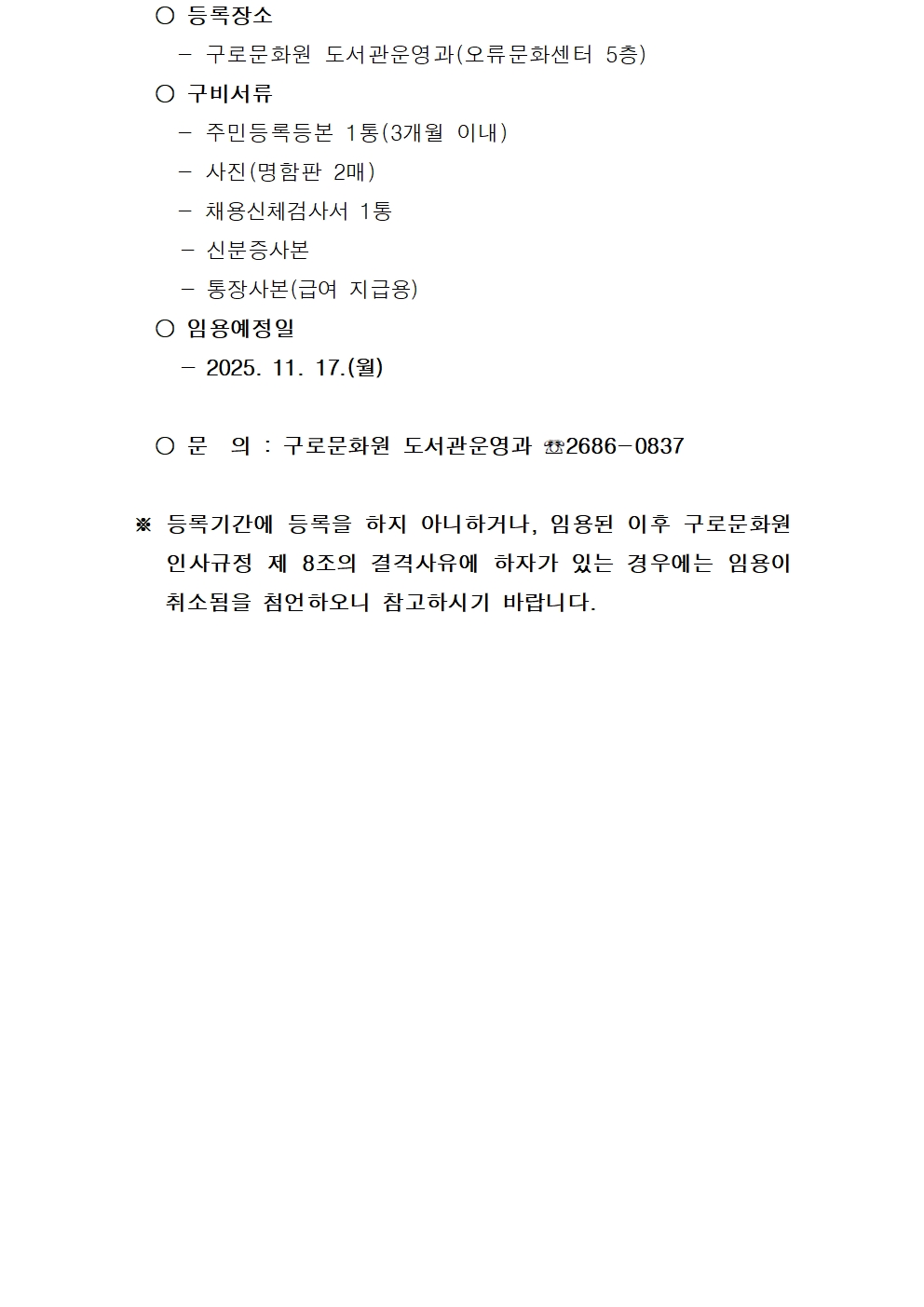 구로문화원 구립도서관 직원채용 최종합격자 공고