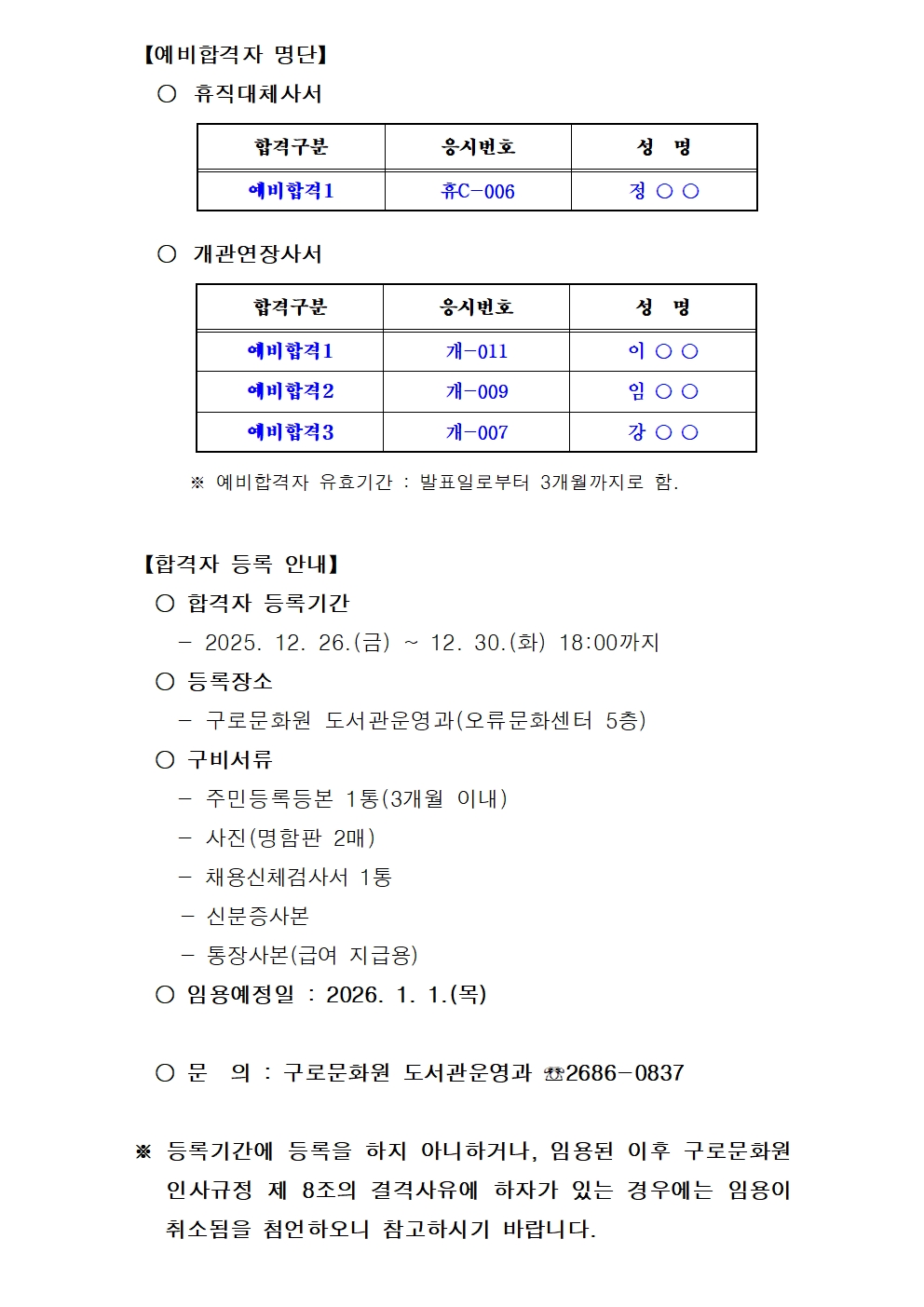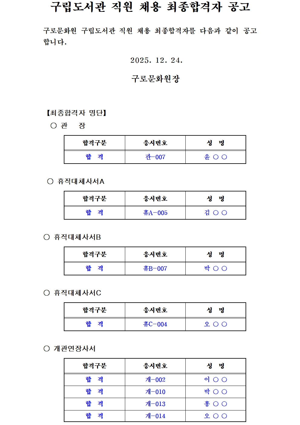 구로문화원 구립도서관 직원채용 최종합격자 공고